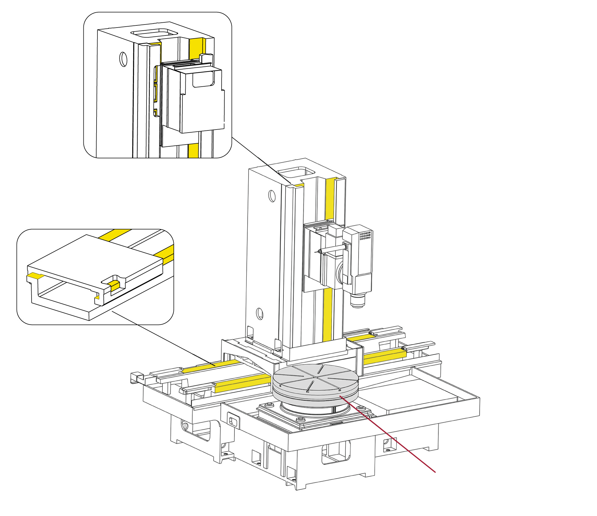 此系列機種皆標準配置HRT液靜壓旋轉工作台,可承載重負荷工件,運轉平穩低振動,對於幾何平面度、垂直度與同心度有優良的表現。